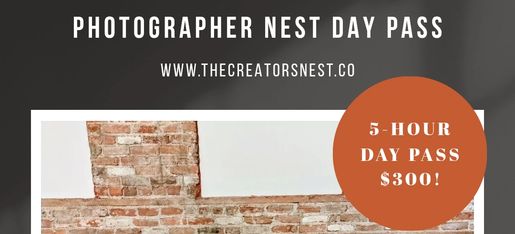 For a limited time, photographers may book a 5-hour Photographer Nest Day Pass for just $300! Click the link to learn more!